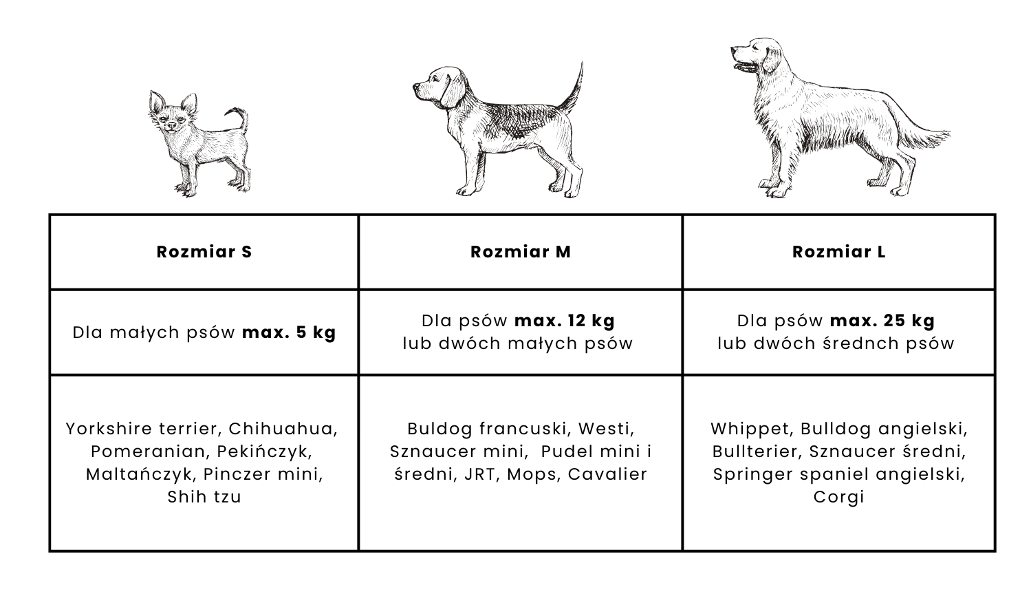 - L – dla psów do 25 kg lub dwóch średnich psów