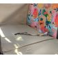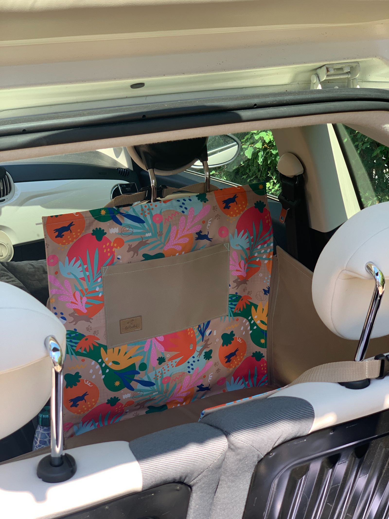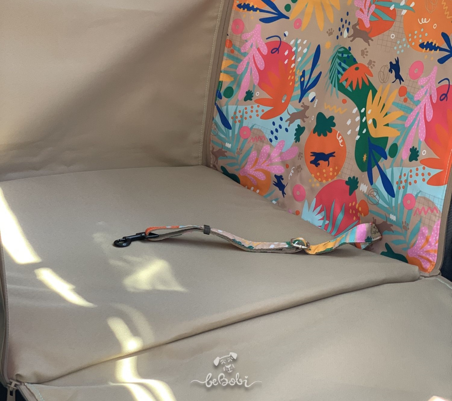 Łatwo montowana za pomocą zapinanych, regulowanych taśm za 2 zagłówki (tył przedniego fotela i tylny zagłówek). Po rozłożeniu tworzy kszałt kosza umożliwiając swobodne podróżowanie pasażera obok. Mata szyta z wytrzymałego poliestru. Wodoodporny materiał - beżowa kodura zapewnia całkowite zabezpieczenie kanapy przed wilgocią, sierścią , brudem i uszkodzeniem mechanicznym, z cieńszą w kolorowy wzór. Całość podkreślona seledynowa stebnówką.