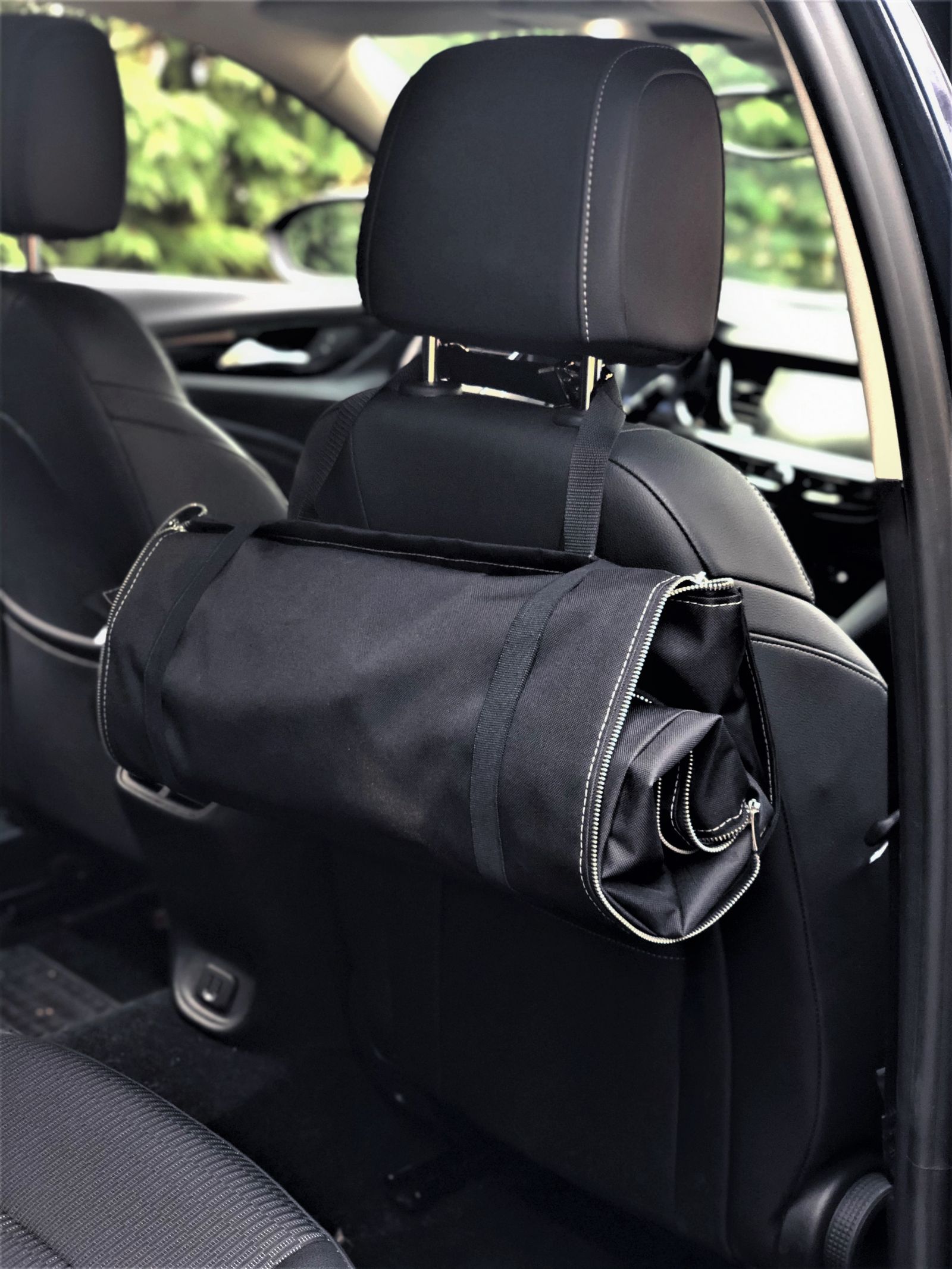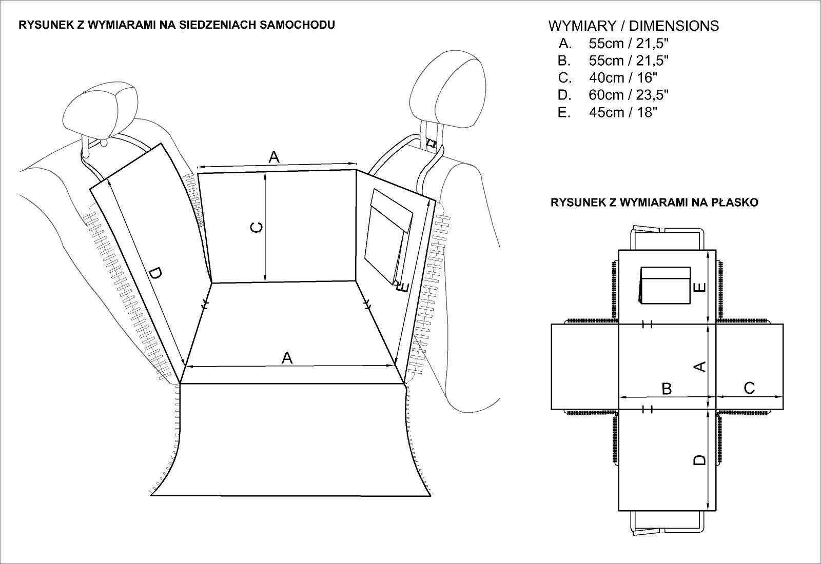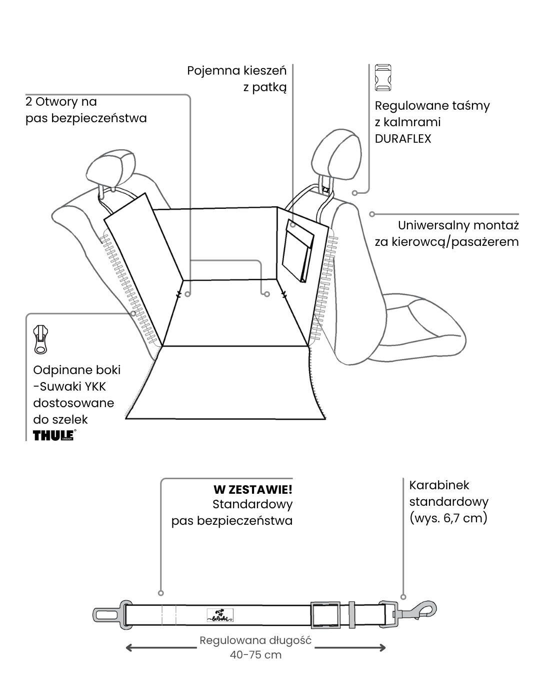 Łatwo montowana za pomocą zapinanych, regulowanych taśm za 2 zagłówki (tył przedniego fotela i tylny zagłówek). Po rozłożeniu tworzy kształt kosza umożliwiając swobodne podróżowanie pasażera obok. Mata szyta z wytrzymałego poliestru. Wodoodporny materiał - czarna kodura zapewnia całkowite zabezpieczenie kanapy przed wilgocią, sierścią , brudem i uszkodzeniem mechanicznym, z cieńszą w kolorowe liście.