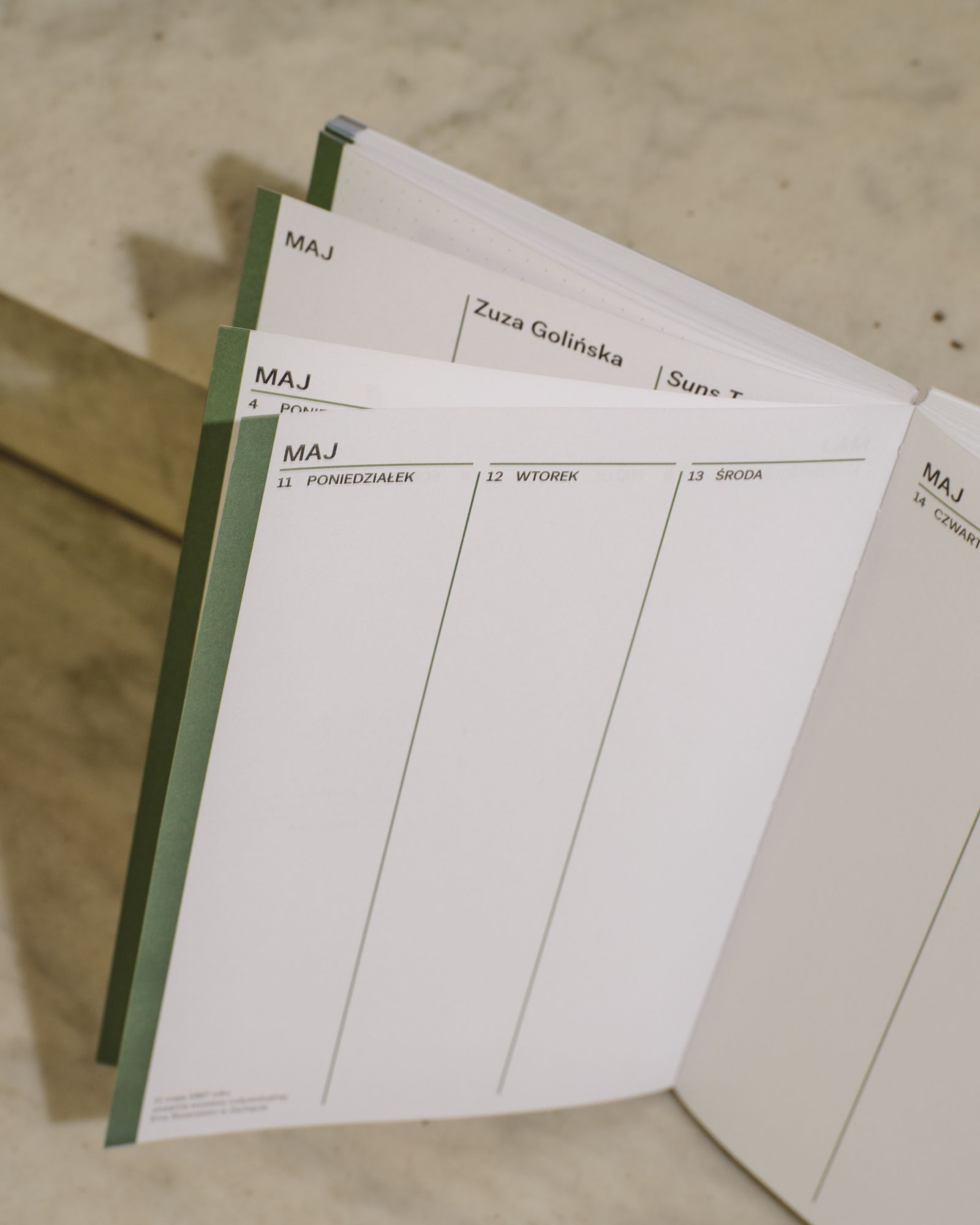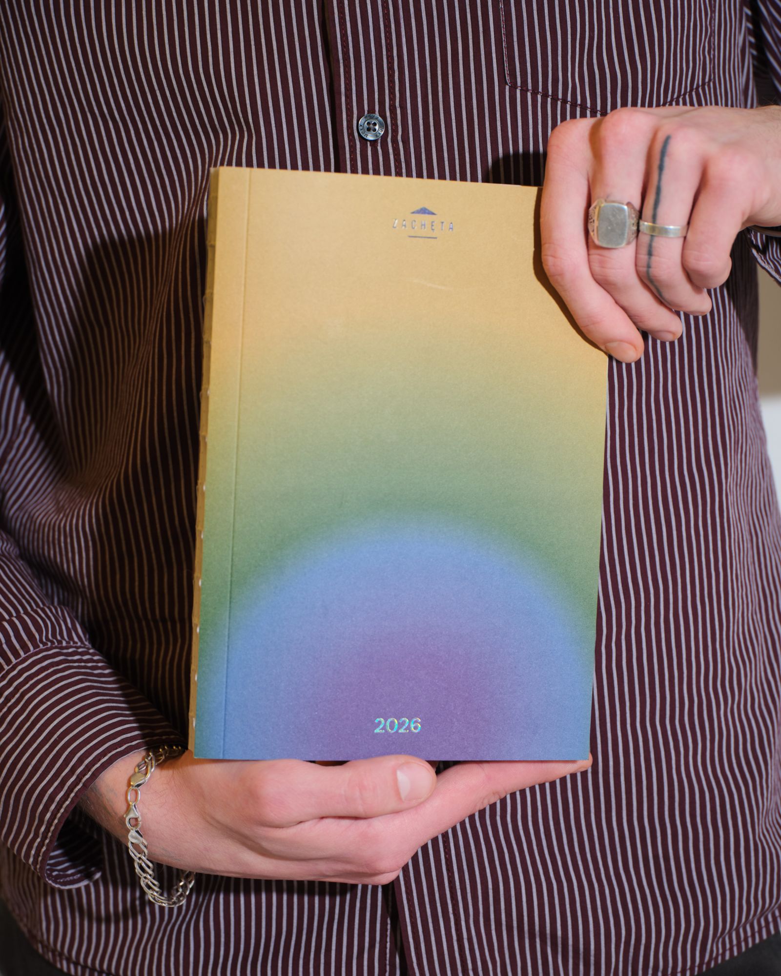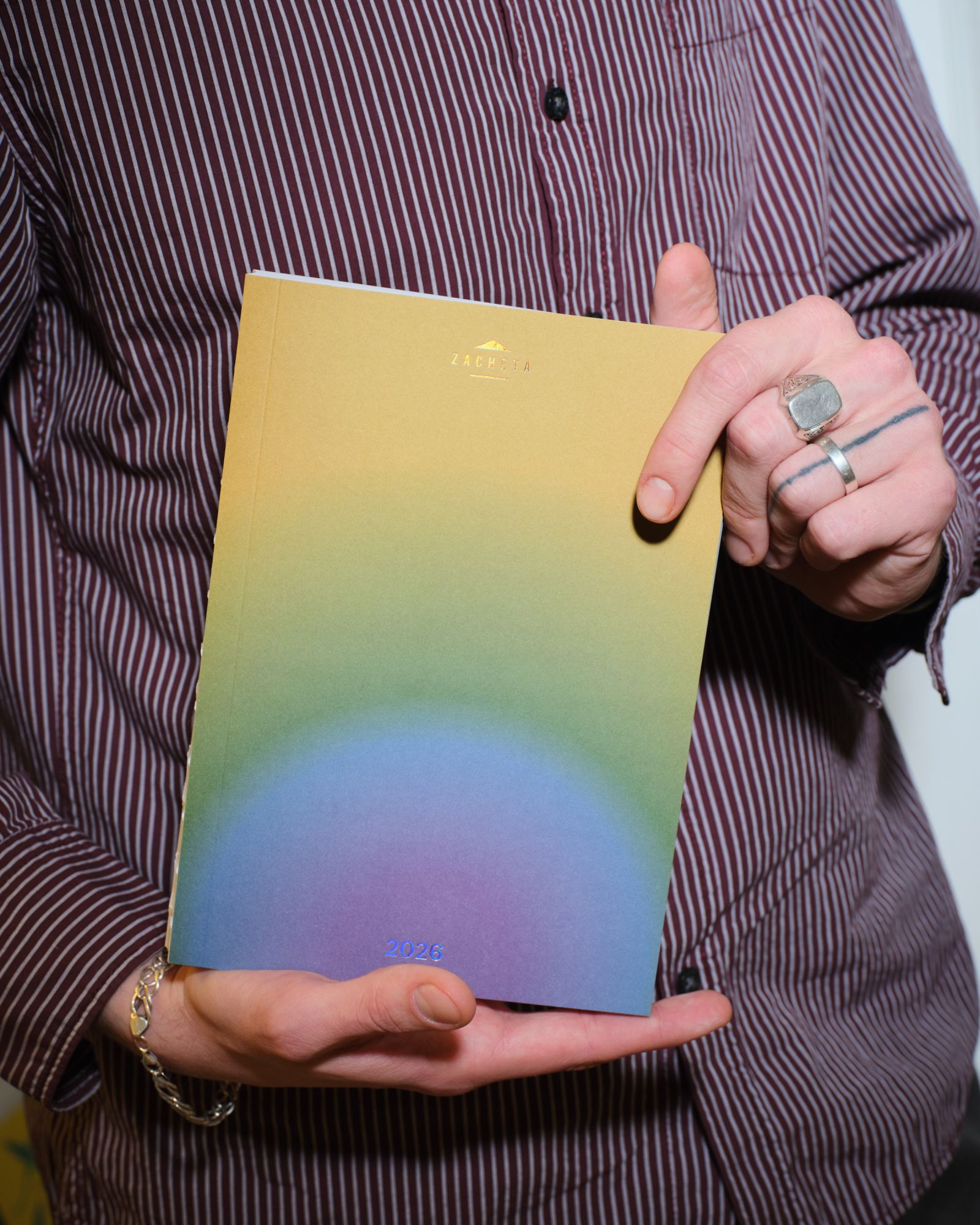 Okładka projektu Olka Modzelewskiego – gradient przypominający mapę termiczną – od zielonej wiosny przez żółty przełom lata i jesieni po błękitno-fioletowe chłody zimy, stanowi reprezentację czasu i pór roku w jednym. Niech kalendarz przypomina, że każda zmiana – w naturze, w sztuce, w życiu – ma swój cykl. W Zachęcie w 2026 roku ten rytm wyznaczają nadchodzące wystawy i spotkania z twórczością Nairy Baghramian, Krzysztofa Gila, Joãa Marii Gusmão, Susan Hiller, Barbary Kasten, Agnieszki Mastalerz, Doroty Podlaskiej, Aliny Szapocznikow, Tobiasa Zielonego, Karoliny Wiktor i wielu innych osób artystycznych.