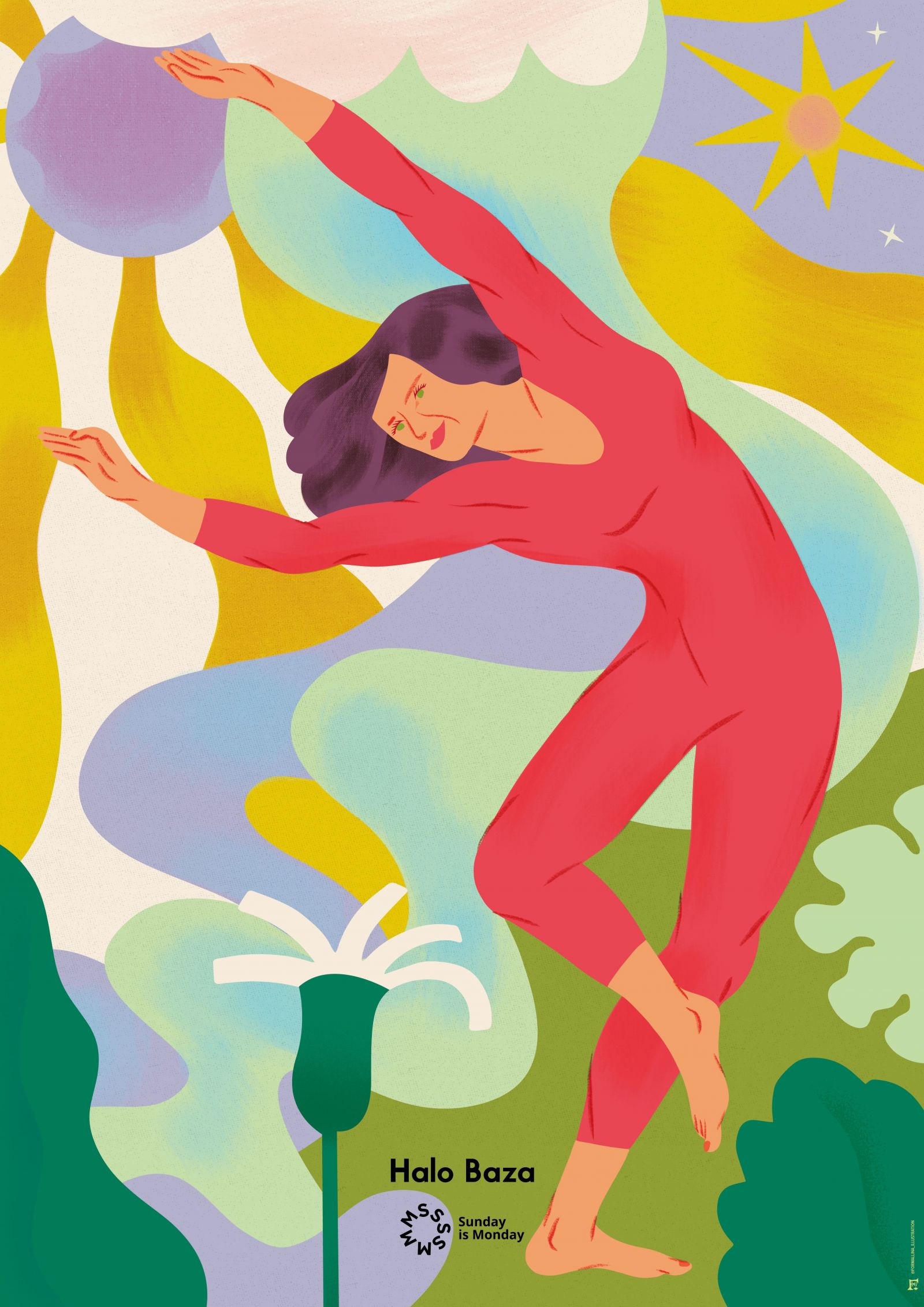 Autorką plakatu jest Iza Kaczmarek-Szurek. Na co dzień projektuje plakaty, ilustracje, a czasem nadruki na tkaniny (min. dla Łukasza Jemioła czy Gosi Baczyńskiej). Jogę porzuciła dawno temu na rzecz wyciskania kilogramów na sztandze w imię zasady: "padnij ale powstań". Dobra siłka nie jest zła!