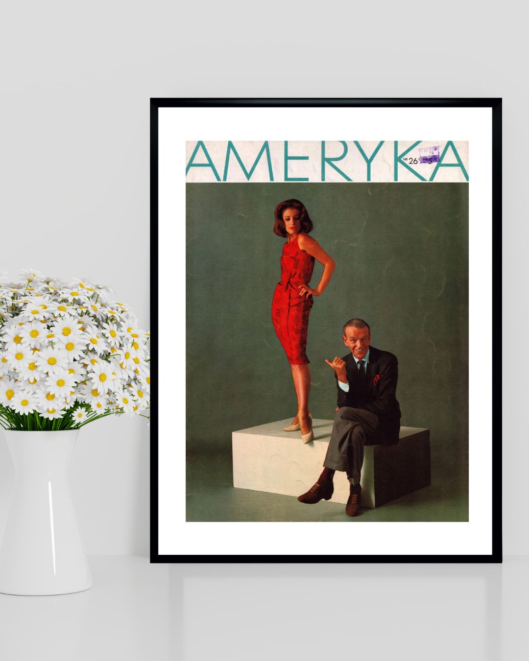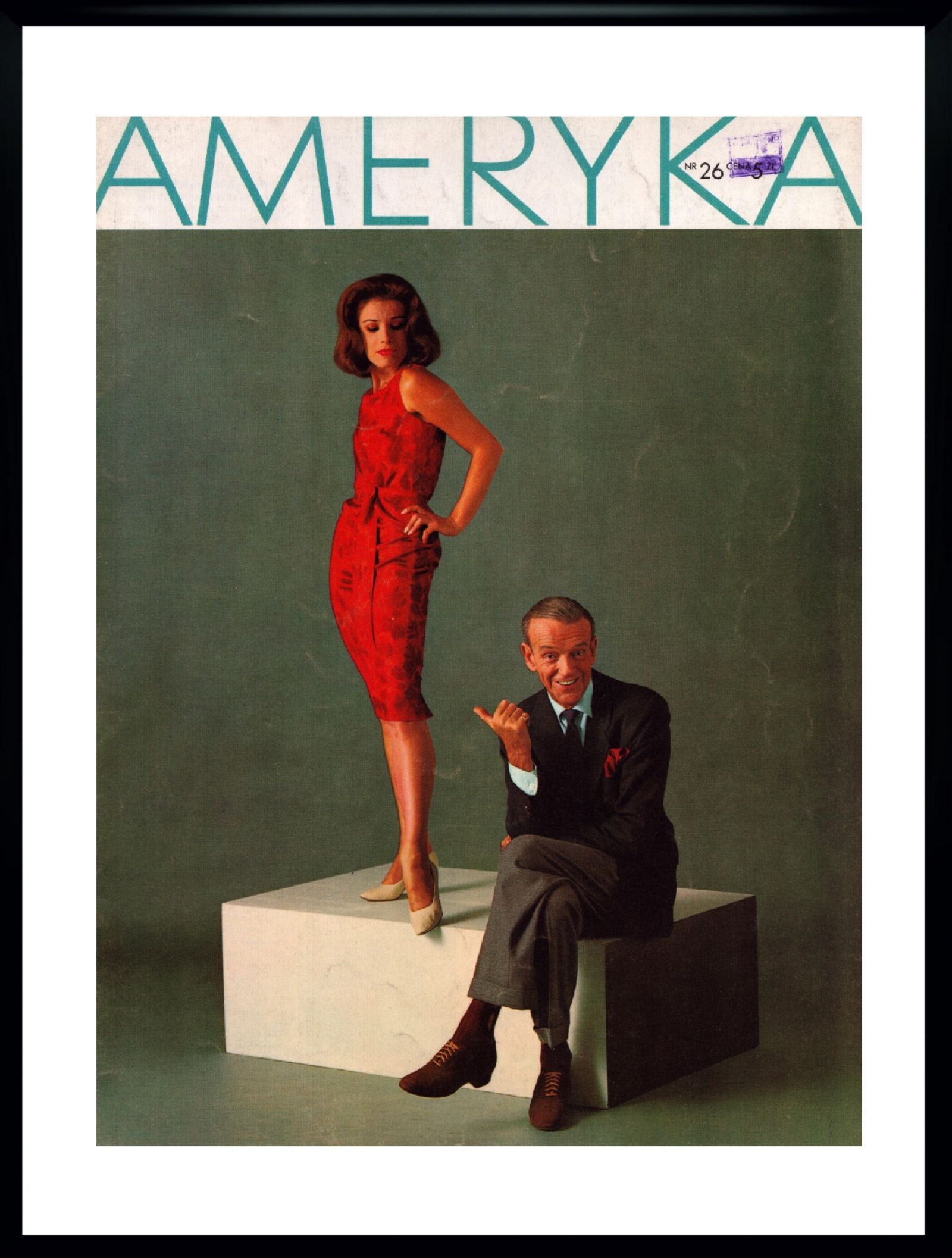 Oprawiona okładka czasopisma AMERYKA z Fred Astaire i Barrie Chase z 1963 r. Okładka w czarnych ramkach o wymiarach 30 x 40 cm