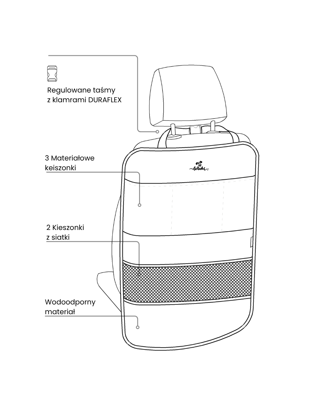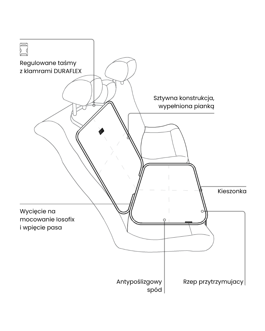 Produkt jest przeznaczony wyłącznie jako ochrona tapicerki pojazdu. Nie zastępuje systemów zabezpieczających fotelika samochodowy dla dziecka ani nie wpływa na poprawność ich działania, jeśli jest używany zgodnie z instrukcją.