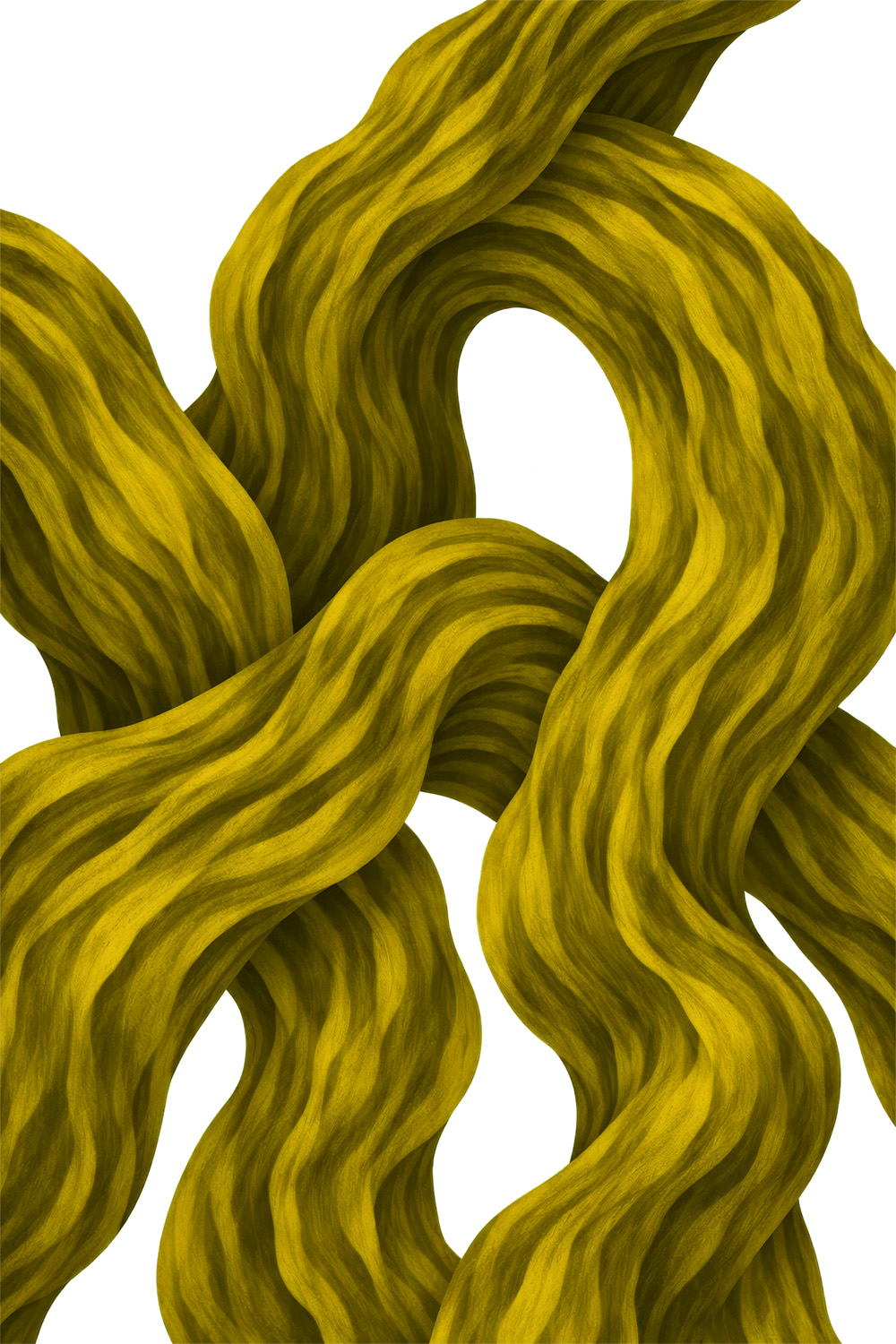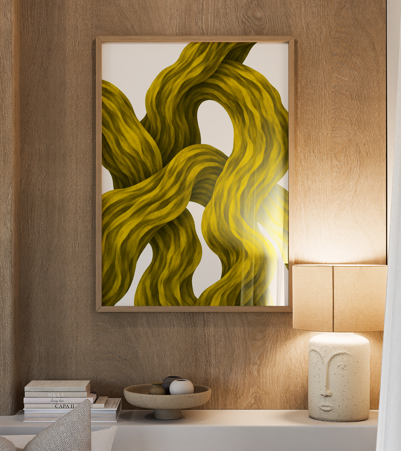 Fale pełne życia i energii. Ten plakat przedstawia przepływającą, organiczną formę, której falujące linie przypominają miękkie, wznoszące się kształty — jak woda, włosy czy liście. Intensywny, oliwkowy odcień żółci nadaje pracy ciepły, naturalny charakter, a delikatne przejścia tonalne wzmacniają wrażenie głębi i ruchu.