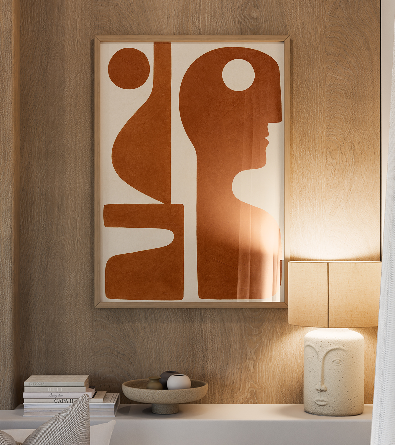 Wielka siła formy zawarta w prostych liniach. Ten plakat, zdominowany przez intensywny, ziemisty odcień terakoty, przedstawia wyrazistą, abstrakcyjną postać — profil ludzkiej głowy połączony z geometrycznym kształtem. Zamiast detali, całość skupia się na formie i symbolice, podkreślając minimalizm i duchową harmonię.