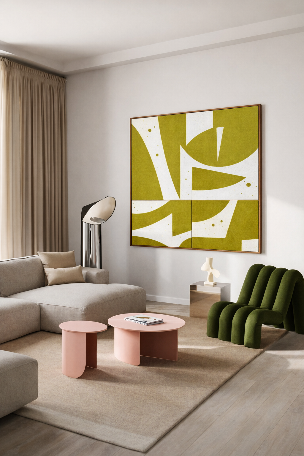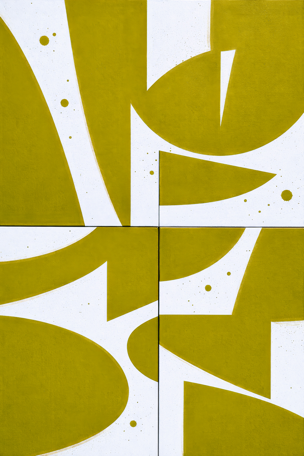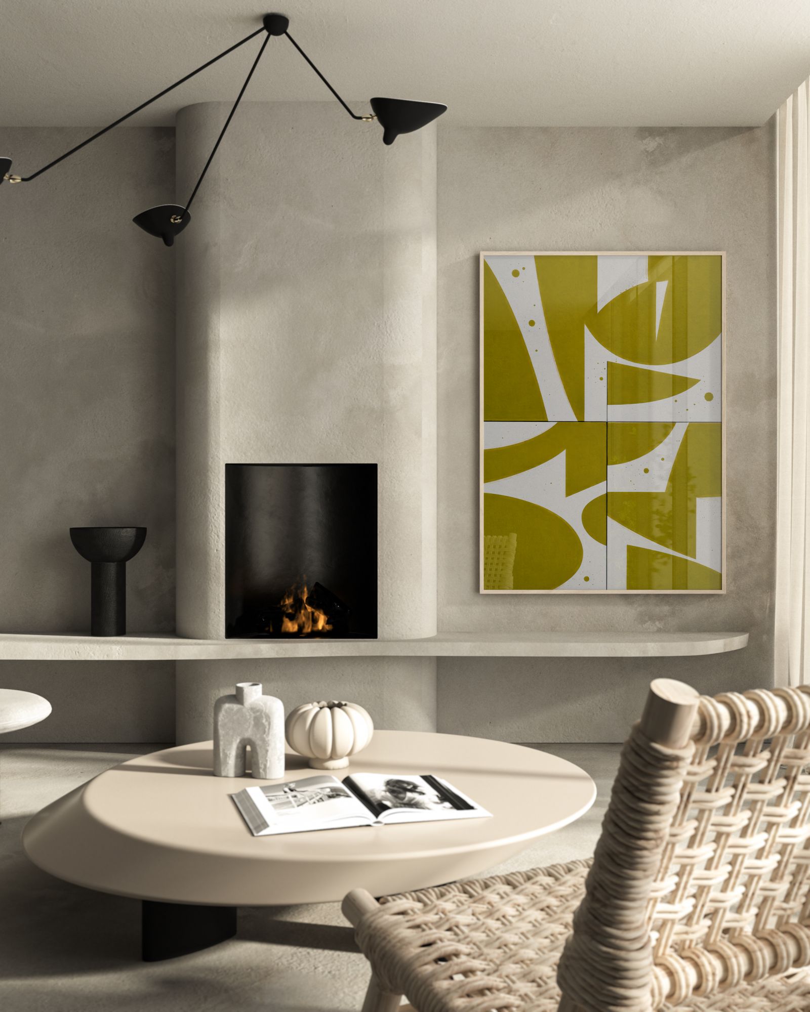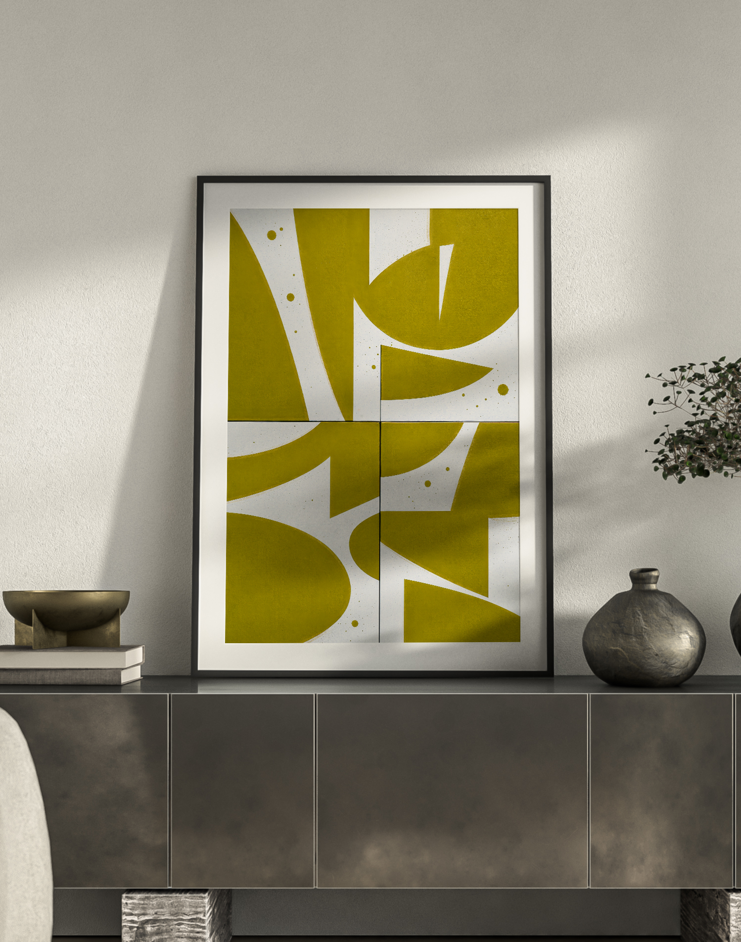Dynamiczna energia w minimalistycznej formie. Ten plakat to intensywna kombinacja kontrastujących kształtów – od zaokrąglonych, niemal organických form, po ostre, geometryczne cięcia. Kolor topazowy, głęboki żółto-zielony, nawiązuje do natury, ale w nowoczesnym, abstrakcyjnym wydaniu. Zestawienie z białym tłem i subtelnymi plamami farby tworzy efekt przypadkowości, jakby dzieło zostało stworzone za pomocą spontanicznego pociągnięcia pędzla.