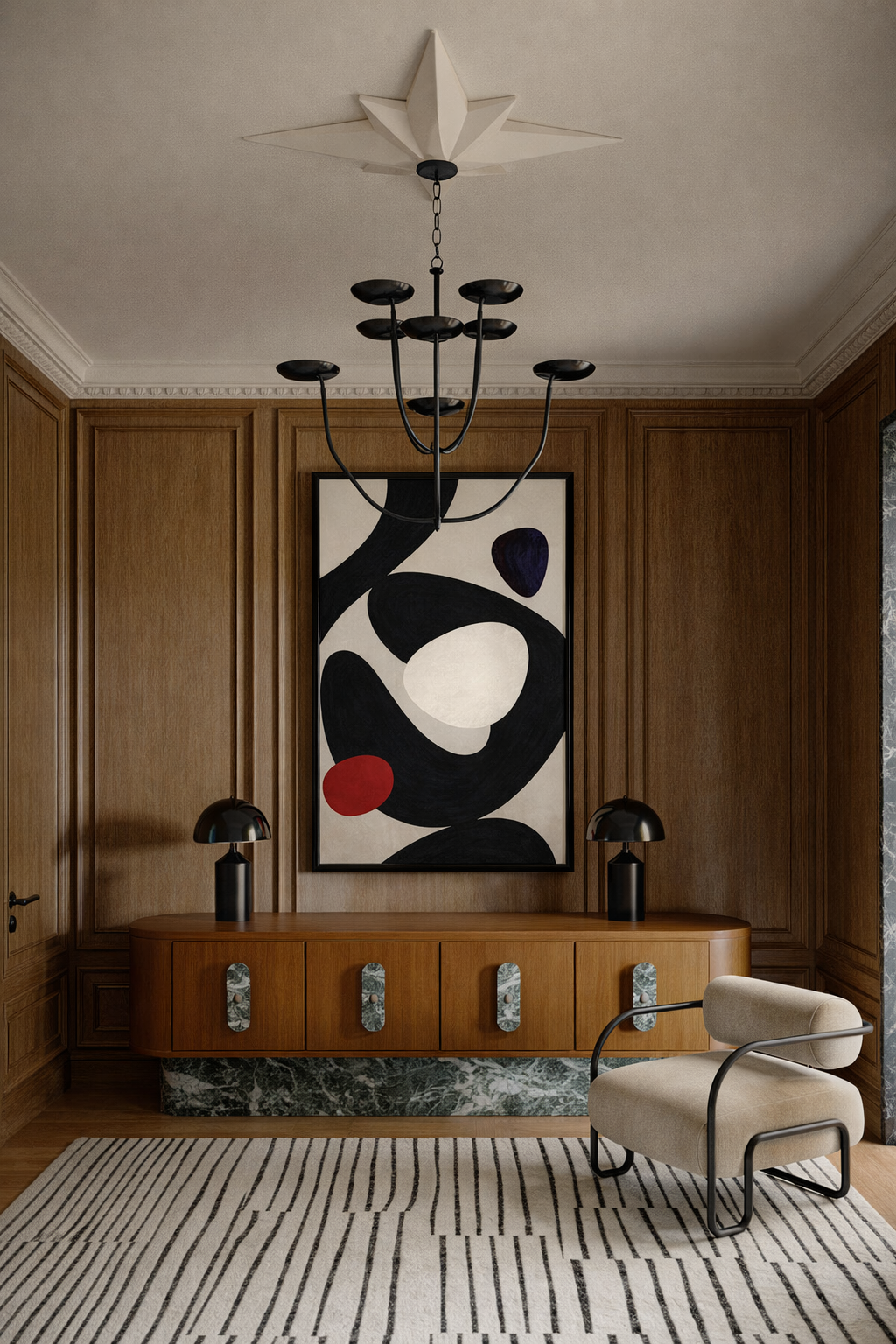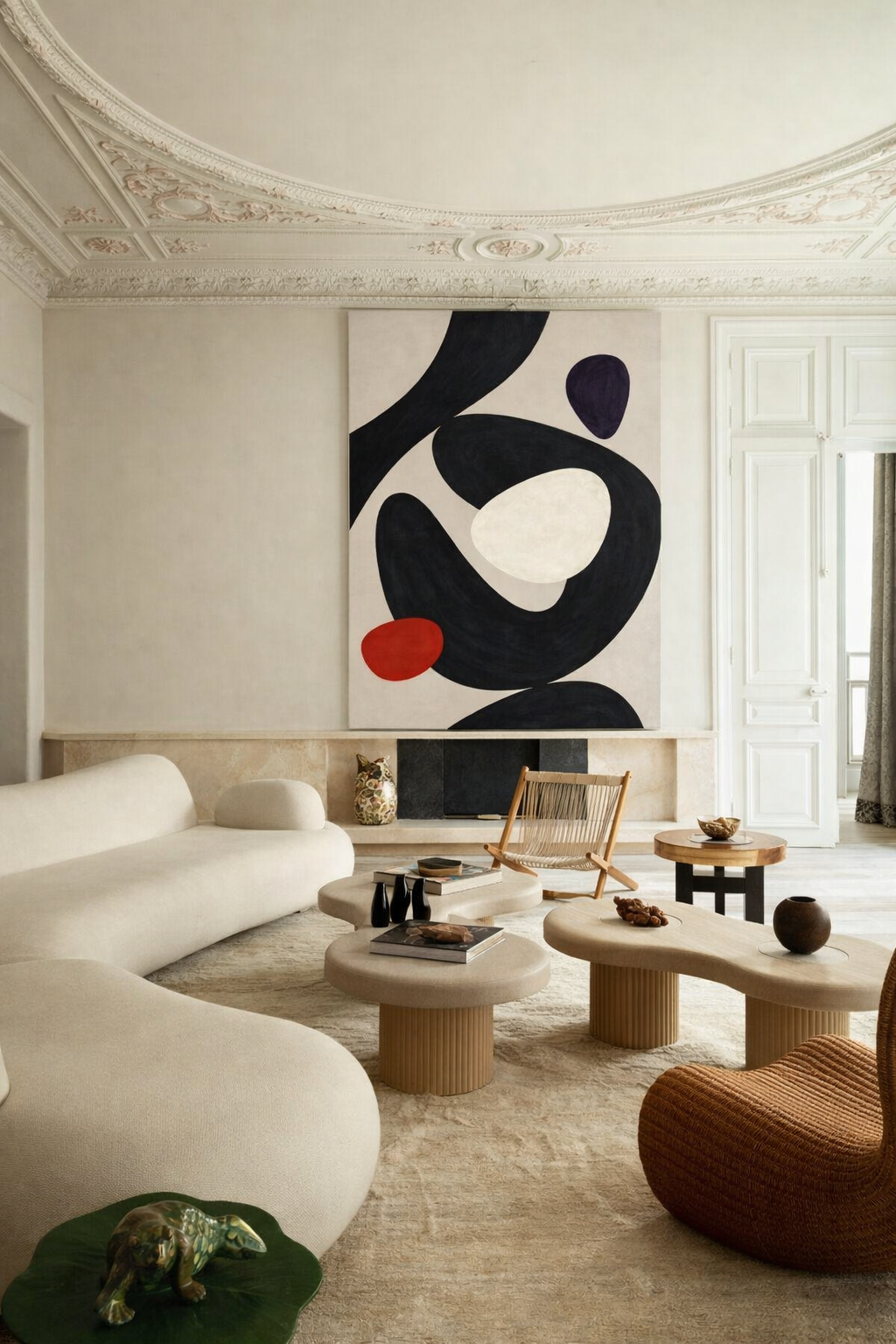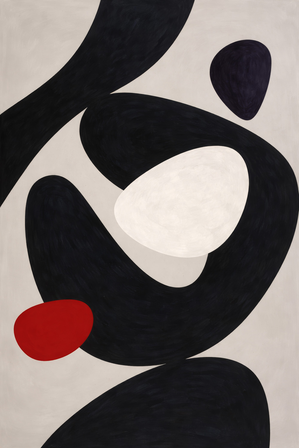Abstrakcyjna energia zamknięta w prostych, ale wyrazistych formach. Plakat łączy intensywne, głębokie czernie z delikatnymi bielami i odważnym akcentem czerwieni, tworząc wizualną harmonię pomiędzy kontrastami. Wysokie, smukłe kształty i organiczne formy płynnie łączą się ze sobą, nadając całości lekkość, a jednocześnie dynamizm.