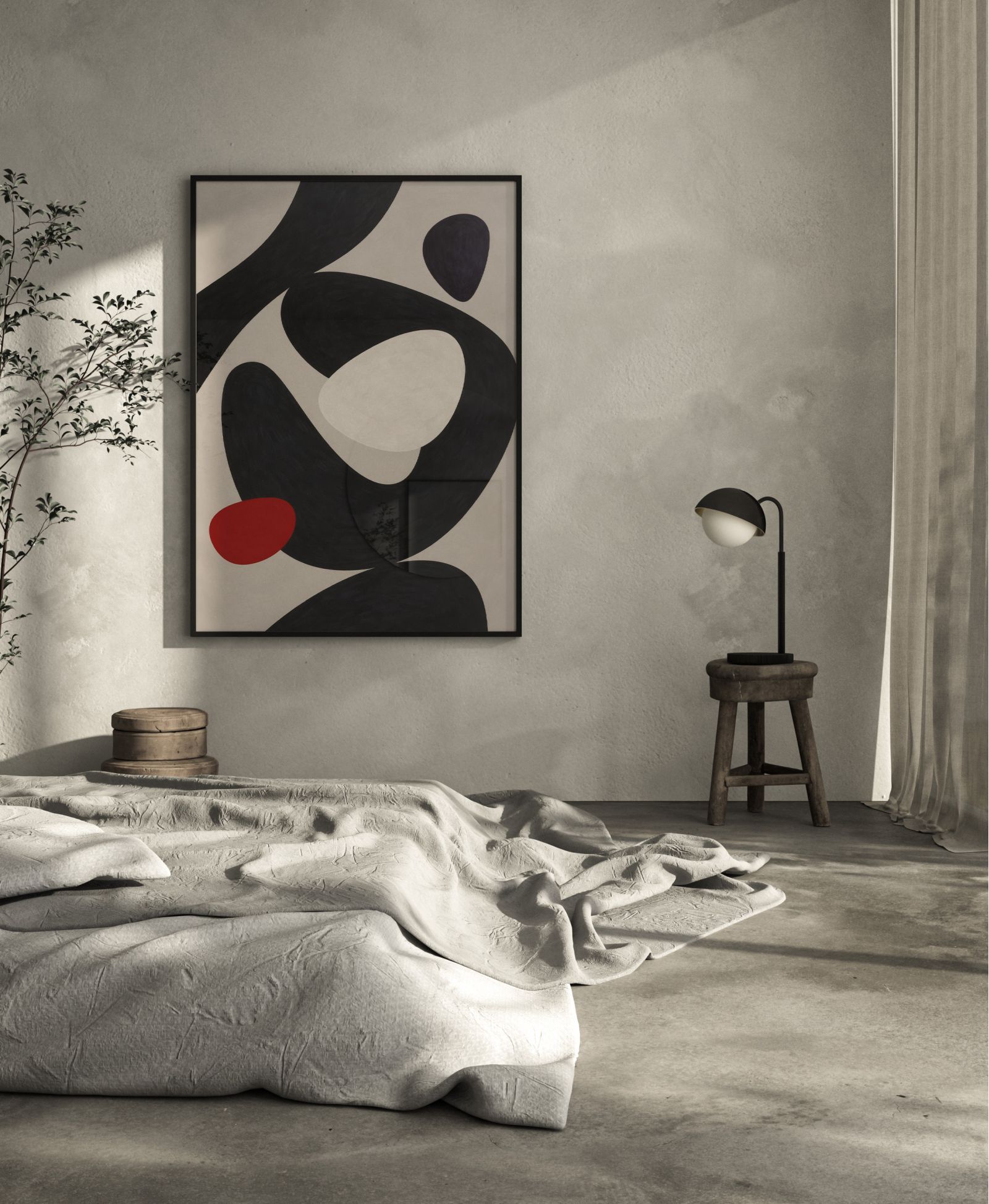 Biel i czerń wprowadzają minimalizm, natomiast czerwony akcent dodaje energii i ekspresji, przełamując surowość kompozycji. To plakat, który świetnie odnajduje się we wnętrzach w stylu modernistycznym, minimalistycznym lub boho, wprowadzając do przestrzeni subtelną, ale wyrazistą atmosferę.