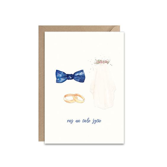 Piękna kartka z akwarelowym niezbędnikiem Młodej Pary - muchą, welonem i obrączkami oraz napisem Raz na całe życie - doskonała jako życzenia z okazji ślubu bliskich lub przyjaciół. Kartkę zdobi reprodukcja ręcznie malowanej akwareli.
