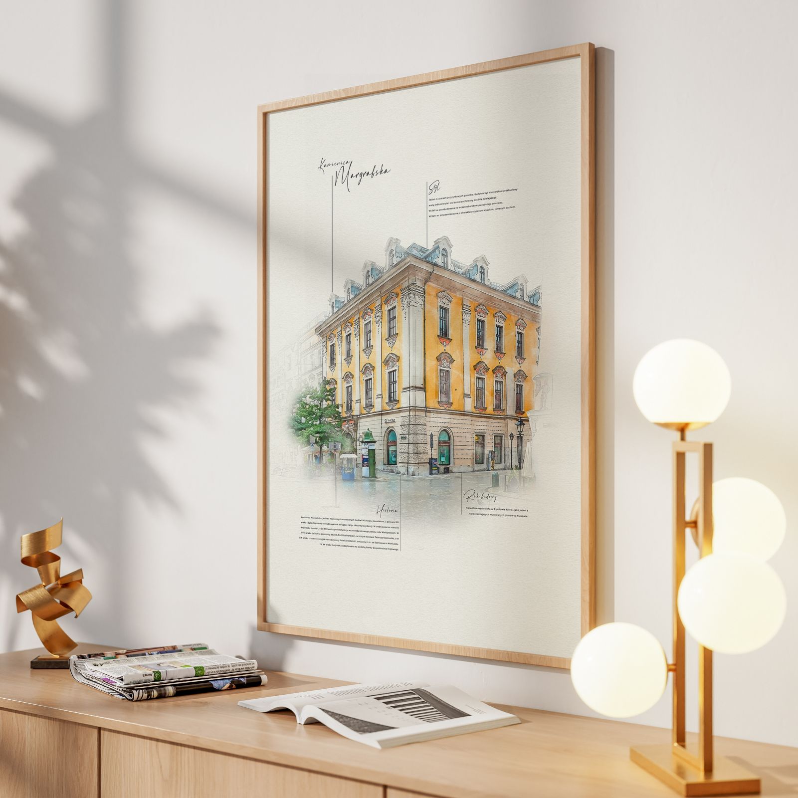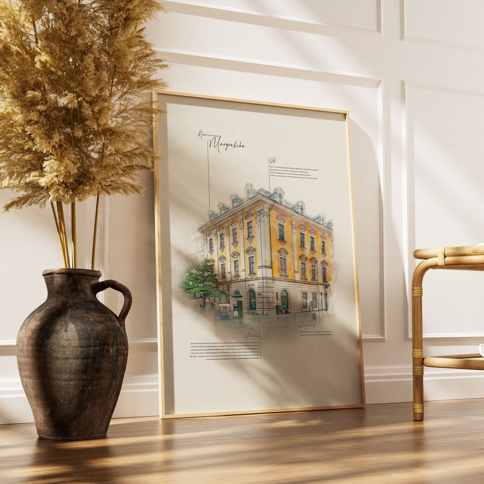 Wnieś do swojego wnętrza powiew krakowskiej historii i elegancji. Ten unikatowy plakat przedstawia jedną z najbardziej rozpoznawalnych budowli Krakowa – Kamienicę Margrabską, usytuowaną u zbiegu Rynku Głównego i ulicy Floriańskiej.